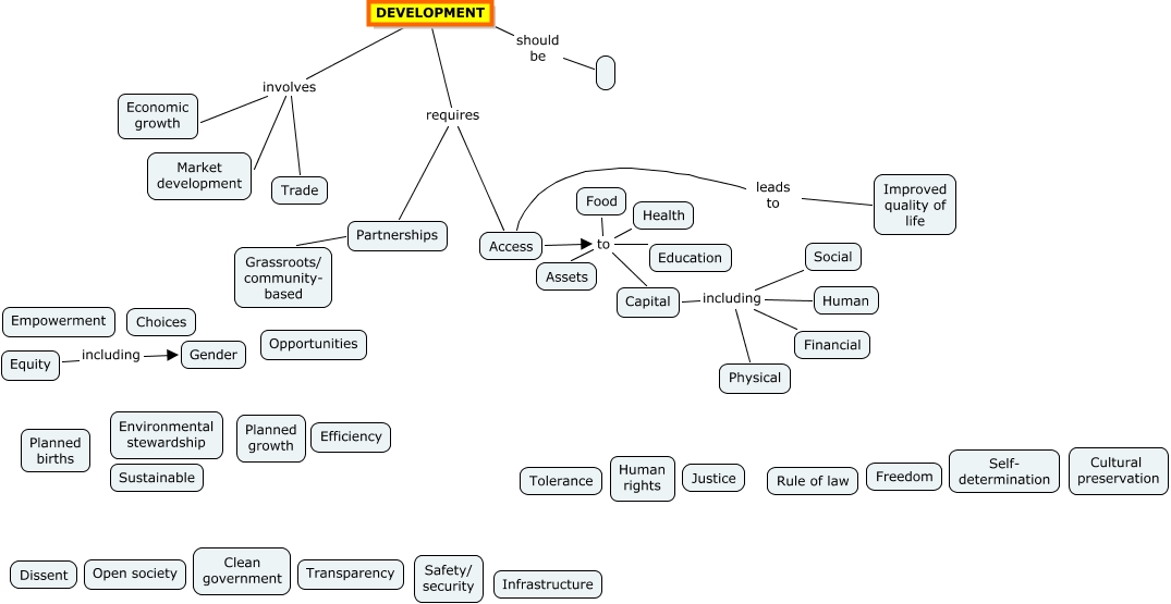 This Concept Map, created with IHMC CmapTools, has information related to: Rosanah - Development, DEVELOPMENT involves Market development, Capital including Human, Capital including Social, Access to Education, Capital including Physical, Access to Capital, DEVELOPMENT involves Trade, should be DEVELOPMENT, Access requires DEVELOPMENT, Grassroots/ community- based Partnerships, Access to Health, Access requires Partnerships, Equity including Gender, Access to Food, DEVELOPMENT involves Economic growth, Access leads to, Capital including Financial, Access to Assets, leads to Improved quality of life