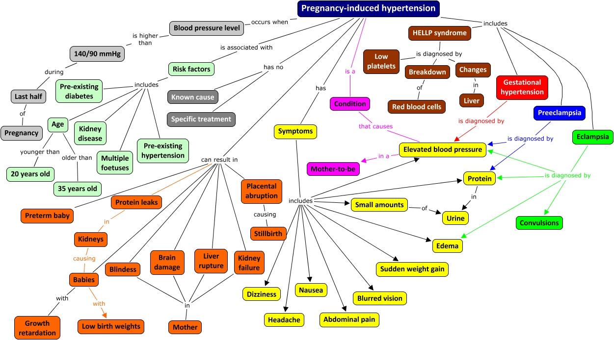This Concept Map, created with IHMC CmapTools, has information related to: Effects of pregnancy-induced hypertension on mother and foetus, Age younger than 20 years old, Placental abruption causing Stillbirth, Symptoms includes Small amounts, Symptoms includes Headache, Risk factors includes Age, Symptoms includes Blurred vision, Pregnancy-induced hypertension can result in Placental abruption, HELLP syndrome is diagnosed by Breakdown, Breakdown of Red blood cells, Changes in Liver, Blood pressure level is higher than 140/90 mmHg, Eclampsia is diagnosed by Edema, Liver rupture in Mother, Pregnancy-induced hypertension can result in Babies, Symptoms includes Abdominal pain, Pregnancy-induced hypertension has no Known cause, Age older than 35 years old, Small amounts of Urine, Pregnancy-induced hypertension has Symptoms, Gestational hypertension is diagnosed by Elevated blood pressure