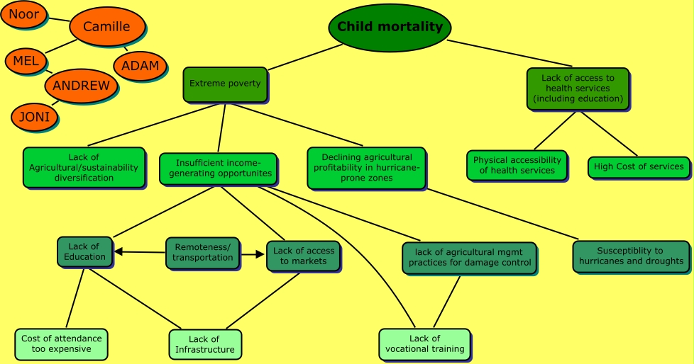 This Concept Map, created with IHMC CmapTools, has information related to: Honduras CMAP-Table 1, Insufficient income- generating opportunites lack of agricultural mgmt practices for damage control, Remoteness/ transportation Lack of Education, Remoteness/ transportation Lack of access to markets, Extreme poverty Lack of Agricultural/sustainability diversification, Insufficient income- generating opportunites Lack of Education, Lack of Infrastructure Lack of Education, ANDREW MEL, Lack of access to health services (including education) High Cost of services, JONI ANDREW, Insufficient income- generating opportunites Lack of vocational training, Lack of Infrastructure Lack of access to markets, Noor Camille, Lack of Education Cost of attendance too expensive, ADAM Camille, MEL Camille, lack of agricultural mgmt practices for damage control Lack of vocational training, Extreme poverty Child mortality, Extreme poverty Insufficient income- generating opportunites, Declining agricultural profitability in hurricane- prone zones Susceptiblity to hurricanes and droughts, Extreme poverty Declining agricultural profitability in hurricane- prone zones