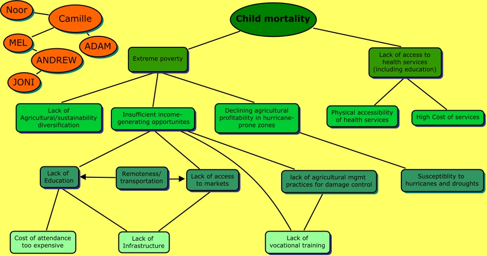 This Concept Map, created with IHMC CmapTools, has information related to: Table 1 - Honduras CMAP, MEL Camille, lack of agricultural mgmt practices for damage control Lack of vocational training, Extreme poverty Child mortality, Child mortality Lack of access to health services (including education), Insufficient income- generating opportunites Lack of Education, Declining agricultural profitability in hurricane- prone zones Susceptiblity to hurricanes and droughts, Lack of Infrastructure Lack of Education, ANDREW MEL, Lack of Infrastructure Lack of access to markets, JONI ANDREW, Lack of access to health services (including education) High Cost of services, Lack of Education Cost of attendance too expensive, Noor Camille, Remoteness/ transportation Lack of Education, ADAM Camille, Insufficient income- generating opportunites Lack of vocational training, Extreme poverty Lack of Agricultural/sustainability diversification, Extreme poverty Insufficient income- generating opportunites, Insufficient income- generating opportunites lack of agricultural mgmt practices for damage control, Remoteness/ transportation Lack of access to markets