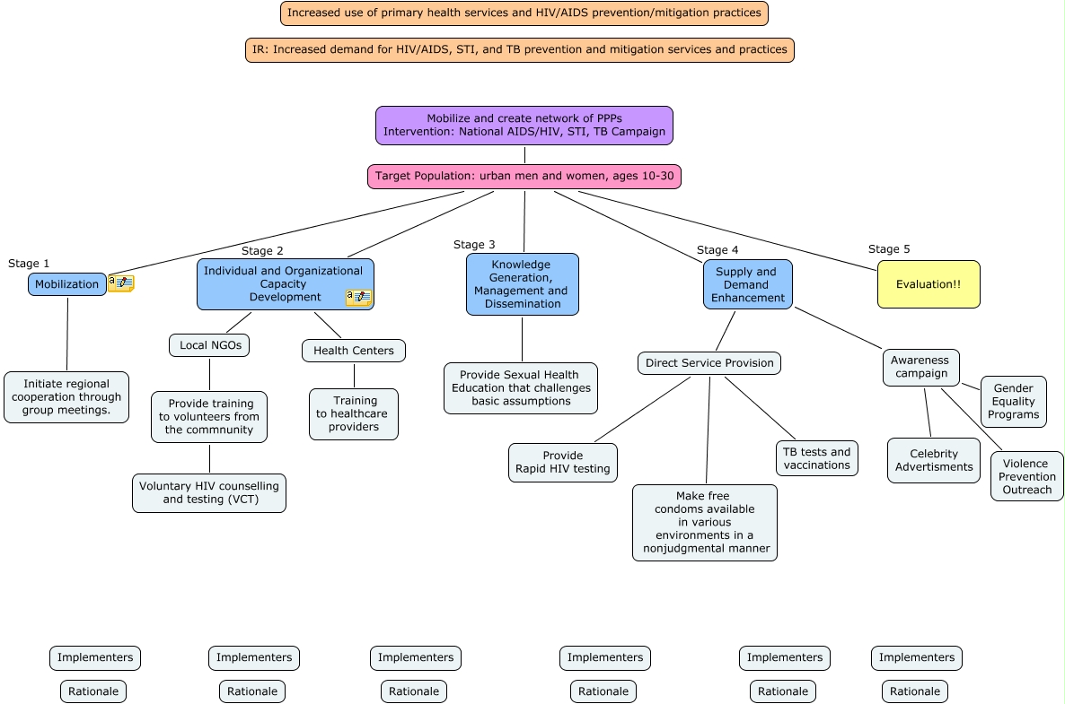 This Concept Map, created with IHMC CmapTools, has information related to: table 5 intervention May 26, Make free condoms available in various environments in a nonjudgmental manner Direct Service Provision, Health Centers Training to healthcare providers, Provide training to volunteers from the commnunity Voluntary HIV counselling and testing (VCT), Individual and Organizational Capacity Development Local NGOs, Awareness campaign Violence Prevention Outreach, Individual and Organizational Capacity Development Health Centers, Supply and Demand Enhancement Target Population: urban men and women, ages 10-30, Awareness campaign Supply and Demand Enhancement, Individual and Organizational Capacity Development Target Population: urban men and women, ages 10-30, Direct Service Provision Supply and Demand Enhancement, Provide Rapid HIV testing Direct Service Provision, Target Population: urban men and women, ages 10-30 Knowledge Generation, Management and Dissemination, Celebrity Advertisments Awareness campaign, Target Population: urban men and women, ages 10-30 Mobilization, Mobilization Initiate regional cooperation through group meetings., Provide Sexual Health Education that challenges basic assumptions Knowledge Generation, Management and Dissemination, Awareness campaign Gender Equality Programs, TB tests and vaccinations Direct Service Provision, Local NGOs Provide training to volunteers from the commnunity, Evaluation!! Target Population: urban men and women, ages 10-30