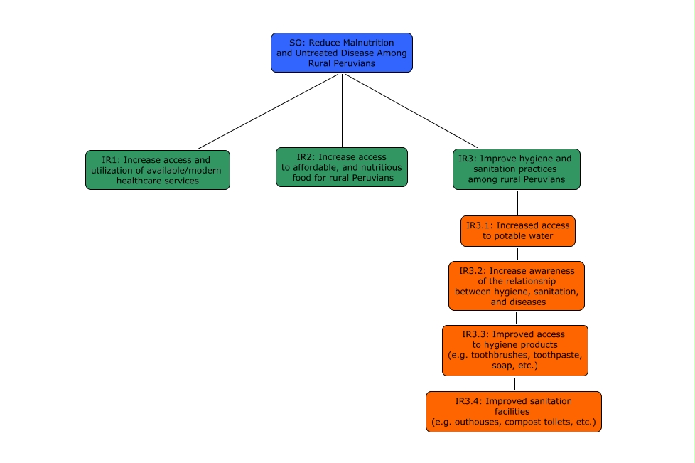 This Concept Map, created with IHMC CmapTools, has information related to: Peru-Social-Results Framework, IR3: Improve hygiene and sanitation practices among rural Peruvians SO: Reduce Malnutrition and Untreated Disease Among Rural Peruvians, IR3.3: Improved access to hygiene products (e.g. toothbrushes, toothpaste, soap, etc.) IR3.2: Increase awareness of the relationship between hygiene, sanitation, and diseases, IR3.2: Increase awareness of the relationship between hygiene, sanitation, and diseases IR3.1: Increased access to potable water, IR1: Increase access and utilization of available/modern healthcare services SO: Reduce Malnutrition and Untreated Disease Among Rural Peruvians, IR3.4: Improved sanitation facilities (e.g. outhouses, compost toilets, etc.) IR3.3: Improved access to hygiene products (e.g. toothbrushes, toothpaste, soap, etc.), IR2: Increase access to affordable, and nutritious food for rural Peruvians SO: Reduce Malnutrition and Untreated Disease Among Rural Peruvians, IR3.1: Increased access to potable water IR3: Improve hygiene and sanitation practices among rural Peruvians