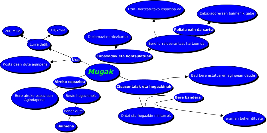 Este Cmap, tiene información relacionada con: Mugak.cmap, Ontzi eta hegazkin militarrek Bere bandera eraman beher dituzte, Beste hegazkinek Behar dute Baimena, Lurraldetik ???? 200 Milia, Mugak Aireko espazioa Bere aireko espazioan Agindapena, Mugak Enbaxadak eta kontsulatuak Bere lurraldearantzat hartzen da, Mugak Itsasontziak eta hegazkinak Ontzi eta hegazkin militarrek, Mugak Aireko espazioa Beste hegazkinek, Mugak Ura Lurraldetik, Mugak Itsasontziak eta hegazkinak Beti bere estatuaren aginpean daude, Mugak Enbaxadak eta kontsulatuak Diplomazia-ordezkariek, Lurraldetik ???? 370kmra, Bere lurraldearantzat hartzen da Polizia ezin da sartu Enbaxadoreraen baimenik gabe, Bere lurraldearantzat hartzen da ???? Ezin- bortzatutako espazioa da, Mugak Ura Kostaldean dute aginpena