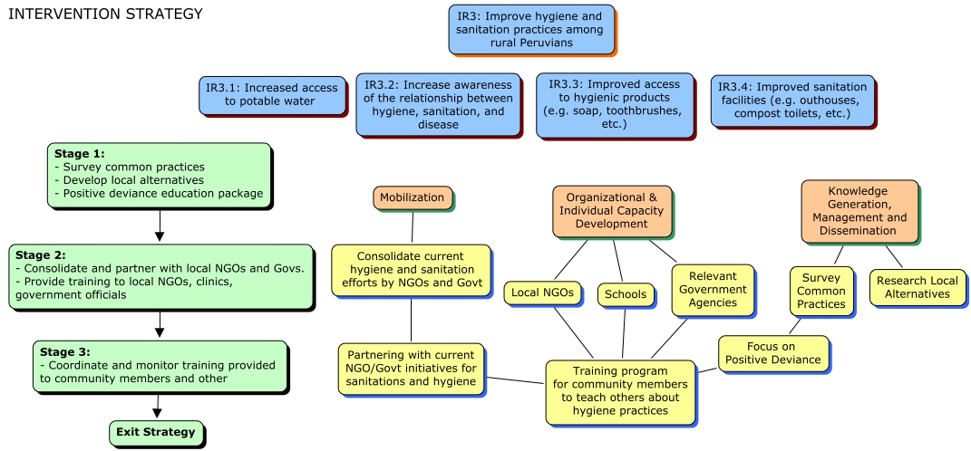 This Concept Map, created with IHMC CmapTools, has information related to: Peru - Social Sector - Intervention Strategy, Stage 2: - Consolidate and partner with local NGOs and Govs. - Provide training to local NGOs, clinics, government officials Stage 3: - Coordinate and monitor training provided to community members and other, Local NGOs Training program for community members to teach others about hygiene practices, Stage 1: - Survey common practices - Develop local alternatives - Positive deviance education package Stage 2: - Consolidate and partner with local NGOs and Govs. - Provide training to local NGOs, clinics, government officials, Relevant Government Agencies Training program for community members to teach others about hygiene practices, Research Local Alternatives Knowledge Generation, Management and Dissemination, Local NGOs Organizational & Individual Capacity Development, Focus on Positive Deviance Training program for community members to teach others about hygiene practices, Knowledge Generation, Management and Dissemination Survey Common Practices, Schools Training program for community members to teach others about hygiene practices, Focus on Positive Deviance Survey Common Practices, Organizational & Individual Capacity Development Relevant Government Agencies, Schools Organizational & Individual Capacity Development, Mobilization Consolidate current hygiene and sanitation efforts by NGOs and Govt, Partnering with current NGO/Govt initiatives for sanitations and hygiene Training program for community members to teach others about hygiene practices, Stage 3: - Coordinate and monitor training provided to community members and other Exit Strategy, Consolidate current hygiene and sanitation efforts by NGOs and Govt Partnering with current NGO/Govt initiatives for sanitations and hygiene