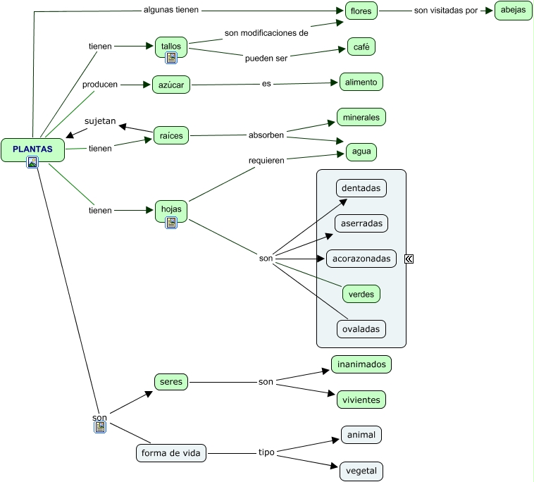 Este Cmap, tiene información relacionada con: Plantas, hojas son ovaladas, tallos son modificaciones de flores, seres son inanimados, raíces absorben agua, raíces sujetan PLANTAS, tallos pueden ser café, PLANTAS son forma de vida, PLANTAS tienen raíces, flores son visitadas por abejas, hojas son aserradas, hojas requieren agua, forma de vida tipo vegetal, hojas son dentadas, raíces absorben minerales, PLANTAS tienen hojas, azúcar es alimento, PLANTAS producen azúcar, PLANTAS son seres, seres son vivientes, forma de vida tipo animal