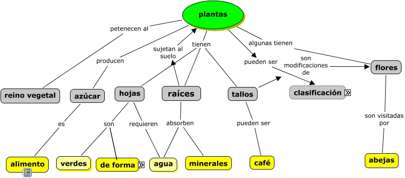 Este Cmap, tiene información relacionada con: Plantas, plantas producen azúcar, plantas tienen raíces, hojas son verdes, tallos son modificaciones de flores, plantas tienen tallos, plantas pueden ser clasificación, flores son visitadas por abejas, plantas algunas tienen flores, raíces absorben minerales, hojas requieren agua, tallos pueden ser café, hojas son alargadas, azúcar es alimento, raíces sujetan al suelo plantas, plantas petenecen al reino vegetal, hojas son acorazonadas, raíces absorben agua, plantas tienen hojas
