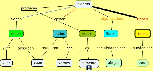 This Concept Map, created with IHMC CmapTools, has information related to: Final, plantas algunas tiene flores, raices ???? ????, plantas tienen tallos, plantas producen azucar, tallos pueden ser cafe, azucar es alimento, raices absorben agua, flores son vistadas por abejas, hojas son verdes, plantas tienen raices, hojas requieren agua, plantas tienen hojas