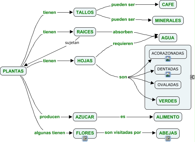 Este Cmap, tiene información relacionada con: plantas, HOJAS son VERDES, AZUCAR es ALIMENTO, PLANTAS producen AZUCAR, TALLOS pueden ser MINERALES, HOJAS son DENTADAS, PLANTAS tienen HOJAS, TALLOS pueden ser CAFE, PLANTAS algunas tienen FLORES, PLANTAS tienen RAICES, PLANTAS tienen TALLOS, FLORES son visitadas por ABEJAS, HOJAS requieren AGUA, RAICES sujetan PLANTAS, RAICES absorben AGUA, HOJAS son OVALADAS, HOJAS son ACORAZONADAS