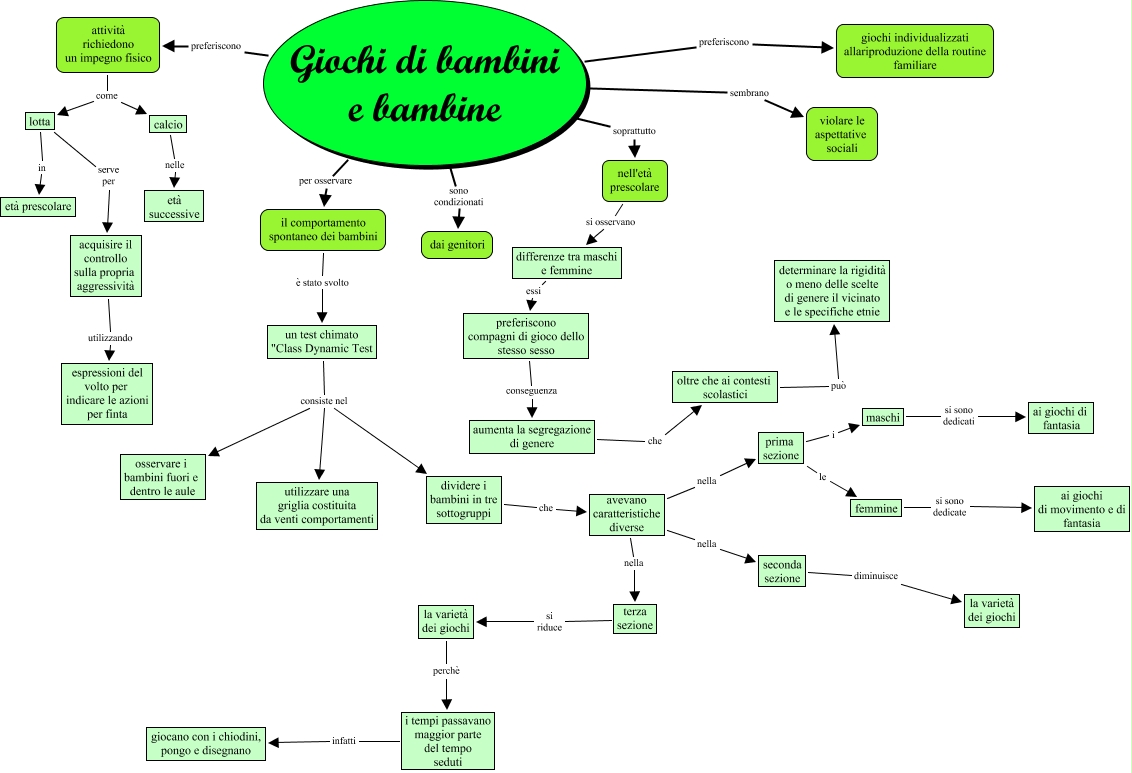 Questa Cmap, creata con IHMC CmapTools, contiene informazioni relative a: giochi di bambini e bambine, acquisire il controllo sulla propria aggressività utilizzando espressioni del volto per indicare le azioni per finta, un test chimato "Class Dynamic Test consiste nel dividere i bambini in tre sottogruppi, Giochi di bambini e bambine soprattutto nell'età prescolare, dividere i bambini in tre sottogruppi che avevano caratteristiche diverse, lotta serve per acquisire il controllo sulla propria aggressività, attività richiedono un impegno fisico come calcio, prima sezione le femmine, un test chimato "Class Dynamic Test consiste nel osservare i bambini fuori e dentro le aule, femmine si sono dedicate ai giochi di movimento e di fantasia, lotta in età prescolare, aumenta la segregazione di genere che oltre che ai contesti scolastici, nell'età prescolare si osservano differenze tra maschi e femmine, i tempi passavano maggior parte del tempo seduti infatti giocano con i chiodini, pongo e disegnano, un test chimato "Class Dynamic Test consiste nel utilizzare una griglia costituita da venti comportamenti, prima sezione i maschi, oltre che ai contesti scolastici può determinare la rigidità o meno delle scelte di genere il vicinato e le specifiche etnie, Giochi di bambini e bambine preferiscono giochi individualizzati allariproduzione della routine familiare, differenze tra maschi e femmine essi preferiscono compagni di gioco dello stesso sesso, la varietà dei giochi perchè i tempi passavano maggior parte del tempo seduti, seconda sezione diminuisce la varietà dei giochi