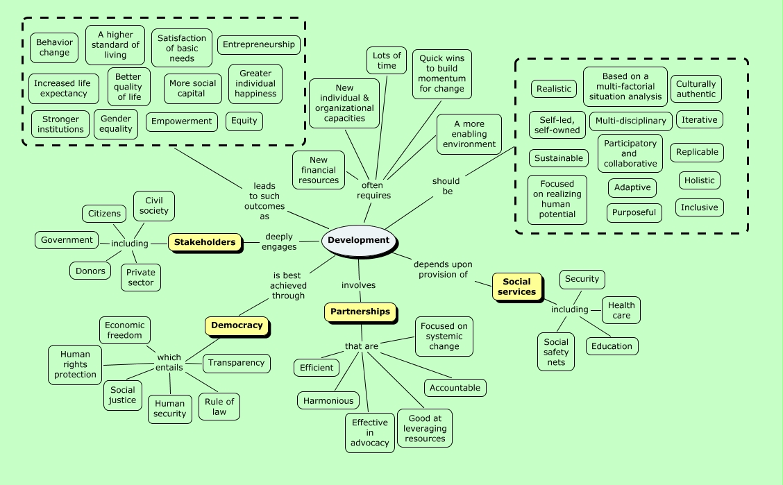 This Concept Map, created with IHMC CmapTools, has information related to: Beryl's original map-edited, Development depends upon provision of Social services, Effective in advocacy that are Good at leveraging resources, Development is best achieved through Democracy, Stakeholders including Donors, Effective in advocacy that are Partnerships, Effective in advocacy that are Accountable, Stakeholders including Civil society, Development often requires Lots of time, Social services including Security, Economic freedom which entails Human rights protection, Democracy which entails Human rights protection, Harmonious that are Accountable, Stakeholders including Government, Economic freedom which entails Social justice, Social services including Health care, Economic freedom which entails Rule of law, Development deeply engages Stakeholders, Harmonious that are Good at leveraging resources, Democracy which entails Human security, Social services including Education