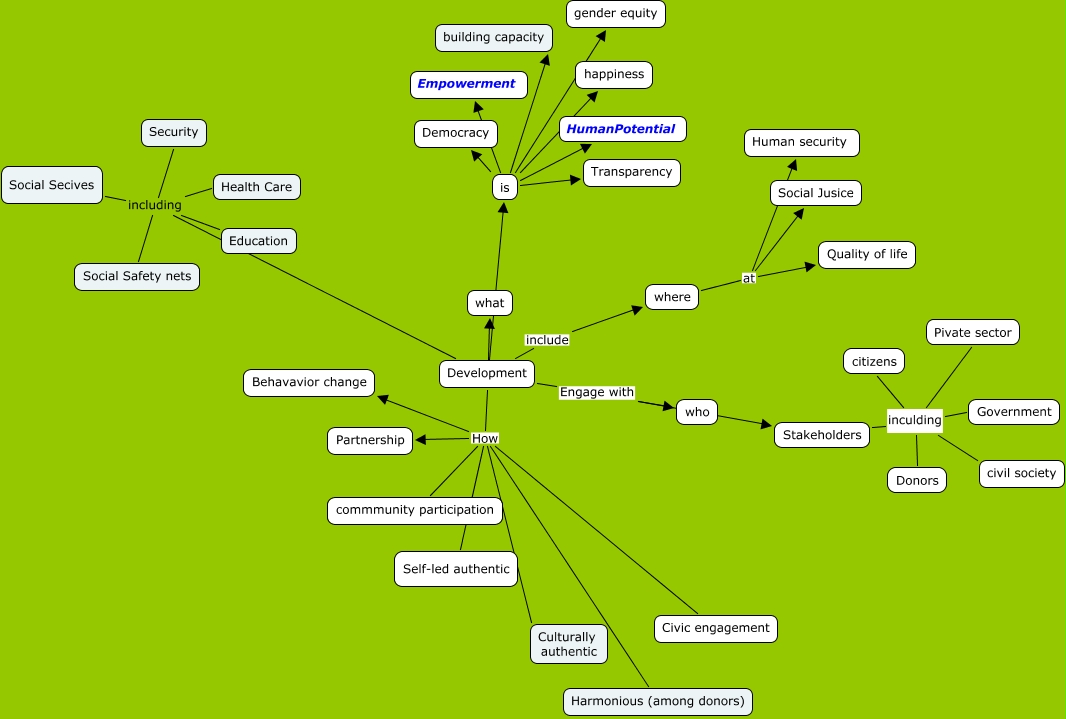 This Concept Map, created with IHMC CmapTools, has information related to: Jue Jue's map, where at Social Jusice, Development ???? what, Social Secives including Security, Development Engage with who, Development ???? is, Social Secives including Education, is HumanPotential, where at Human security, is gender equity, Development including Security, is Democracy, Development How Harmonious (among donors), Development including Education, Social Secives including Social Safety nets, Development How Partnership, Stakeholders inculding Government, is happiness, is Transparency, Development including Health Care, Stakeholders inculding Donors