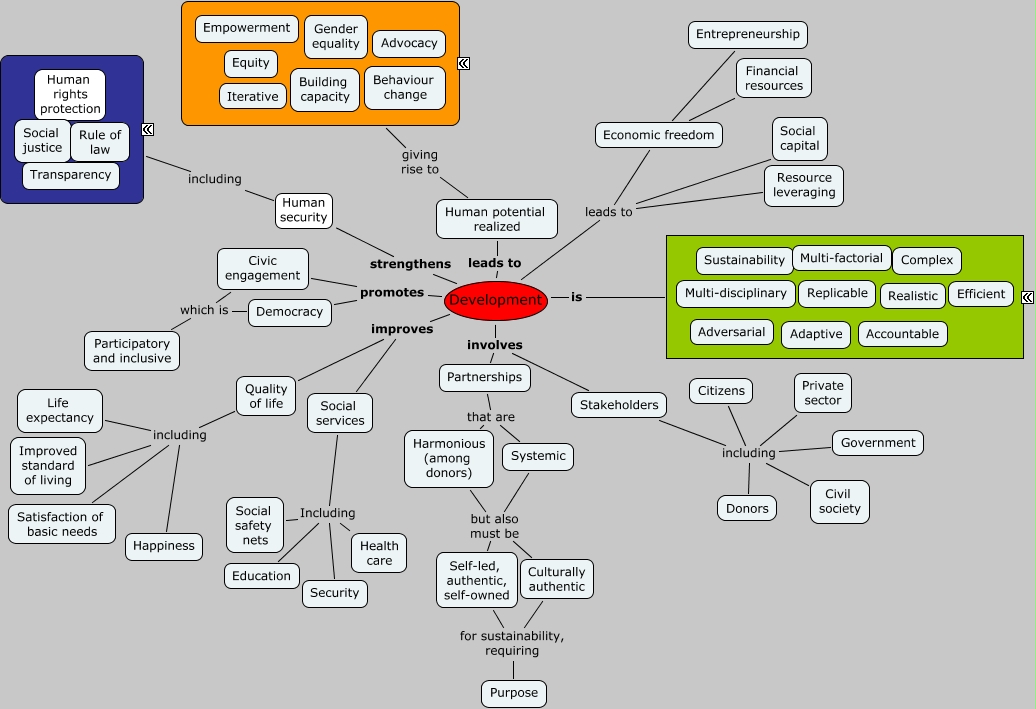 This Concept Map, created with IHMC CmapTools, has information related to: Henry's map, Stakeholders including Donors, Development involves Partnerships, Economic freedom Entrepreneurship, Quality of life including Life expectancy, Stakeholders including Private sector, Human potential realized giving rise to ????, Stakeholders including Government, Culturally authentic for sustainability, requiring Purpose, Development is ????, Development involves Stakeholders, Partnerships that are Systemic, Development promotes Civic engagement, Economic freedom Financial resources, Development leads to Human potential realized, Development improves Social services, Democracy which is Participatory and inclusive, Harmonious (among donors) but also must be Self-led, authentic, self-owned, Quality of life including Happiness, Systemic but also must be Culturally authentic, Human security including ????