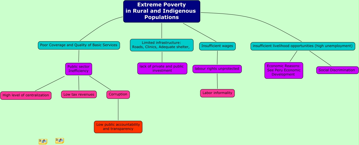 This Concept Map, created with IHMC CmapTools, has information related to: Peru Problem Tree, High level of centralization Public sector Inefficiency, Labor informality labour rights unprotected, Limited infrastructure: Roads, Clinics, Adequate shelter, Extreme Poverty in Rural and Indigenous Populations, Corruption Public sector Inefficiency, Extreme Poverty in Rural and Indigenous Populations Insufficient wages, labour rights unprotected Insufficient wages, Extreme Poverty in Rural and Indigenous Populations Poor Coverage and Quality of Basic Services, Economic Reasons: See Peru Economic Development insufficient livelihood opportunities (high unemployment), Poor Coverage and Quality of Basic Services Public sector Inefficiency, lack of private and public investment Limited infrastructure: Roads, Clinics, Adequate shelter,, Extreme Poverty in Rural and Indigenous Populations insufficient livelihood opportunities (high unemployment), Social Discrimination insufficient livelihood opportunities (high unemployment), Low tax revenues Public sector Inefficiency, Low public accountability and transparency Corruption