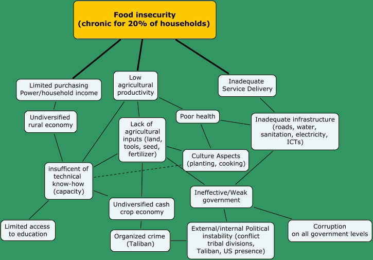 This Concept Map, created with IHMC CmapTools, has information related to: Afghan Econ, Inadequate Service Delivery Food insecurity (chronic for 20% of households), Poor health Low agricultural productivity, Culture Aspects (planting, cooking) Poor health, Inadequate infrastructure (roads, water, sanitation, electricity, ICTs) Inadequate Service Delivery, External/internal Political instability (conflict tribal divisions, Taliban, US presence) Ineffective/Weak government, Organized crime (Taliban) External/internal Political instability (conflict tribal divisions, Taliban, US presence), Lack of agricultural inputs (land, tools, seed, fertilizer) Low agricultural productivity, Ineffective/Weak government Lack of agricultural inputs (land, tools, seed, fertilizer), insufficent of technical know-how (capacity) Lack of agricultural inputs (land, tools, seed, fertilizer), Limited purchasing Power/household income Food insecurity (chronic for 20% of households), Ineffective/Weak government Inadequate infrastructure (roads, water, sanitation, electricity, ICTs), Poor health Inadequate infrastructure (roads, water, sanitation, electricity, ICTs), Undiversified cash crop economy Lack of agricultural inputs (land, tools, seed, fertilizer), Culture Aspects (planting, cooking) Lack of agricultural inputs (land, tools, seed, fertilizer), Organized crime (Taliban) Undiversified cash crop economy, Undiversified rural economy Limited purchasing Power/household income, insufficent of technical know-how (capacity) Culture Aspects (planting, cooking), insufficent of technical know-how (capacity) Low agricultural productivity, insufficent of technical know-how (capacity) Limited access to education, insufficent of technical know-how (capacity) Undiversified cash crop economy