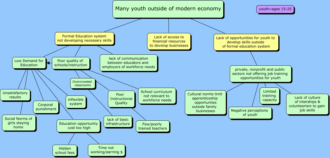 This Concept Map, created with IHMC CmapTools, has information related to: Kenya Youth for Ecotourism Initiative, Low Demand for Education Corporal punishment, private, nonprofit and public sectors not offering job training opportunities for youth Lack of opportunities for youth to develop skills outside of formal education system, Poor quality of schools/instruction School curriculum not relevant to workforce needs, Poor quality of schools/instruction Poor Instructional Quality, Education opportunity cost too high Time not working/earning $, Low Demand for Education Social Norms of girls staying home, private, nonprofit and public sectors not offering job training opportunities for youth Cultural norms limit apprenticeship opportunties outside family businesses, Formal Education system not developing necessary skills lack of communication between educators and employers of workforce needs, private, nonprofit and public sectors not offering job training opportunities for youth Negative perceptions of youth, Overcrowded classrooms lack of basic infrastructure, Poor quality of schools/instruction Low Demand for Education, private, nonprofit and public sectors not offering job training opportunities for youth Lack of culture of interships & volunteerism to gain job skills, Low Demand for Education Education opportunity cost too high, Low Demand for Education inflexible system, Many youth outside of modern economy Lack of opportunities for youth to develop skills outside of formal education system, Many youth outside of modern economy Formal Education system not developing necessary skills, Education opportunity cost too high Hidden school fees, Poor Instructional Quality Few/poorly trained teachers, Formal Education system not developing necessary skills Low Demand for Education, private, nonprofit and public sectors not offering job training opportunities for youth Limited training capacity