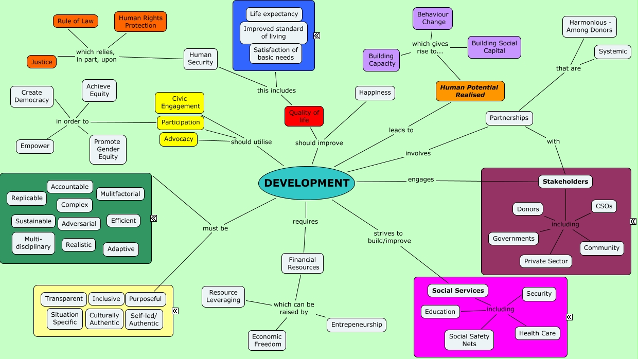 This Concept Map, created with IHMC CmapTools, has information related to: Joseph Gridley, DEVELOPMENT should improve Happiness, DEVELOPMENT requires Financial Resources, Human Security which relies, in part, upon Rule of Law, Human Security which relies, in part, upon Justice, DEVELOPMENT should utilise Participation, Participation in order to Promote Gender Equity, Human Potential Realised which gives rise to... Building Social Capital, Partnerships that are Harmonious - Among Donors, DEVELOPMENT must be Purposeful, Financial Resources which can be raised by Entrepeneurship, Stakeholders including Governments, Partnerships with Stakeholders, Stakeholders including Donors, DEVELOPMENT leads to Human Potential Realised, Human Potential Realised which gives rise to... Behaviour Change, Participation in order to Achieve Equity, Participation in order to Empower, DEVELOPMENT must be, Human Potential Realised which gives rise to... Building Capacity, Participation in order to Create Democracy