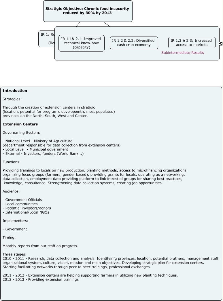 This Concept Map, created with IHMC CmapTools, has information related to: Strategy Afghan, IR 2: Agricultural production increased ????, IR 1: Rural purchasing power increased (livelihood improved) ????, Stratigic Objective: Chronic food insecurity reduced by 30% by 2013 IR 2: Agricultural production increased, Stratigic Objective: Chronic food insecurity reduced by 30% by 2013 IR 1: Rural purchasing power increased (livelihood improved)