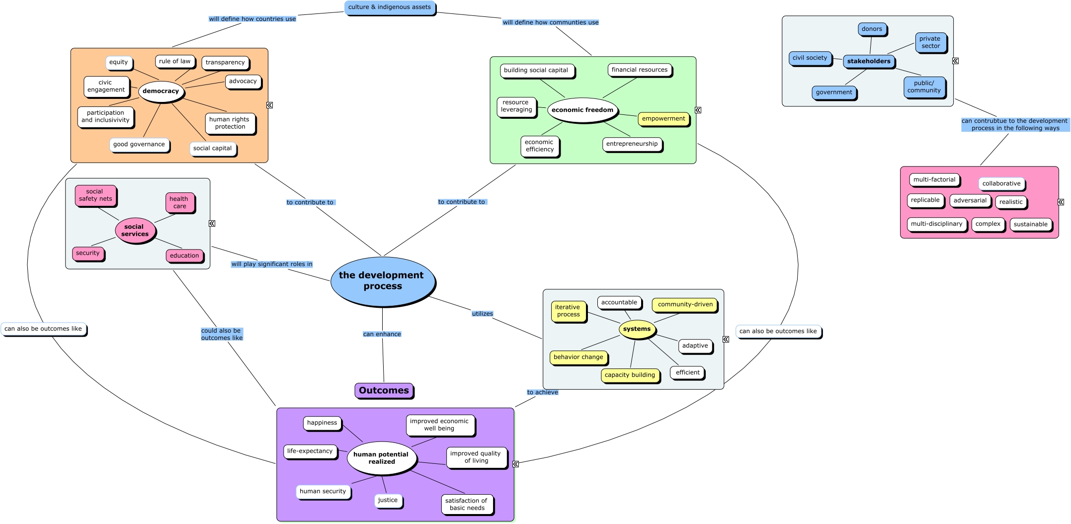 This Concept Map, created with IHMC CmapTools, has information related to: Cameron's cmap1, efficient systems, democracy participation and inclusivivity, democracy social capital, economic freedom economic efficiency, systems capacity building, social services education, systems iterative process, democracy rule of law, human potential realized improved economic well being, the development process can enhance Outcomes, systems behavior change, social services social safety nets, stakeholders private sector, culture & indigenous assets will define how communties use ????, equity democracy, ???? will play significant roles in the development process, democracy human rights protection, economic freedom financial resources, ???? could also be outcomes like ????, ???? to contribute to the development process