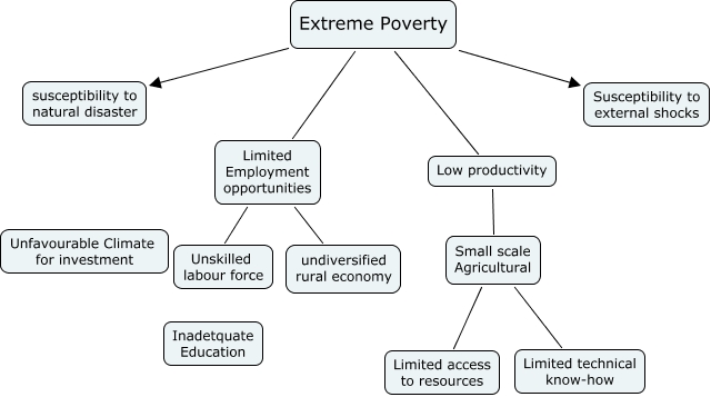 This Concept Map, created with IHMC CmapTools, has information related to: table 4 day 2.2, Extreme Poverty Susceptibility to external shocks, Limited Employment opportunities undiversified rural economy, Extreme Poverty Limited Employment opportunities, Small scale Agricultural Limited access to resources, Low productivity Small scale Agricultural, Extreme Poverty susceptibility to natural disaster, Limited Employment opportunities Unskilled labour force, Small scale Agricultural Limited technical know-how, Extreme Poverty Low productivity