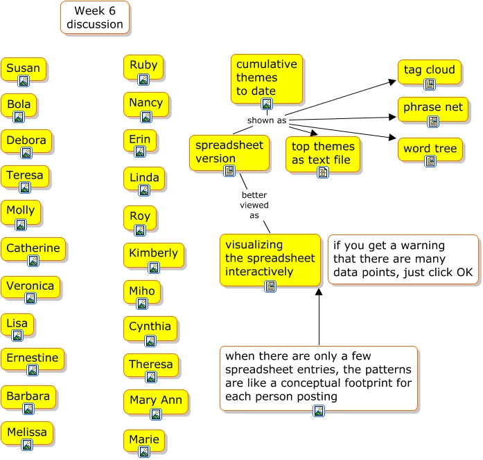 This Concept Map, created with IHMC CmapTools, has information related to: Week 6 discussion, when there are only a few spreadsheet entries, the patterns are like a conceptual footprint for each person posting visualizing the spreadsheet interactively, cumulative themes to date shown as tag cloud, cumulative themes to date shown as phrase net, cumulative themes to date shown as top themes as text file, spreadsheet version better viewed as visualizing the spreadsheet interactively, cumulative themes to date shown as spreadsheet version, cumulative themes to date shown as word tree