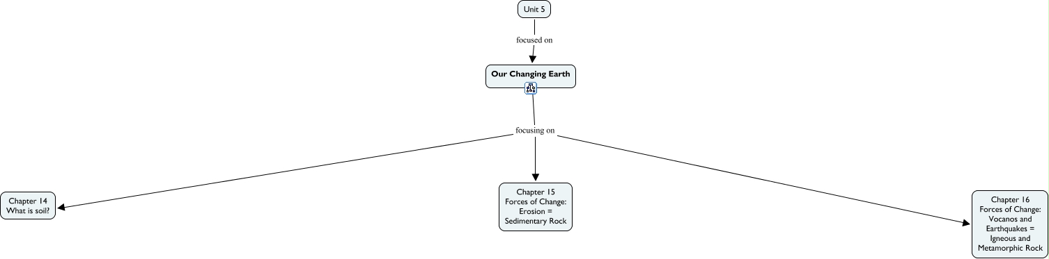 This Concept Map, created with IHMC CmapTools, has information related to: Unit 5 - Our Changing Earth, Our Changing Earth focusing on Chapter 14 What is soil?, Unit 5 focused on Our Changing Earth, Our Changing Earth focusing on Chapter 16 Forces of Change: Vocanos and Earthquakes = Igneous and Metamorphic Rock, Our Changing Earth focusing on Chapter 15 Forces of Change: Erosion = Sedimentary Rock