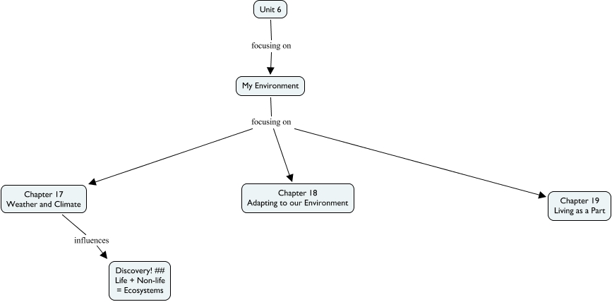 This Concept Map, created with IHMC CmapTools, has information related to: Unit 6 - My Environment, My Environment focusing on Chapter 17 Weather and Climate, My Environment focusing on Chapter 18 Adapting to our Environment, Chapter 17 Weather and Climate influences Discovery! ## Life + Non-life = Ecosystems, Unit 6 focusing on My Environment, My Environment focusing on Chapter 19 Living as a Part