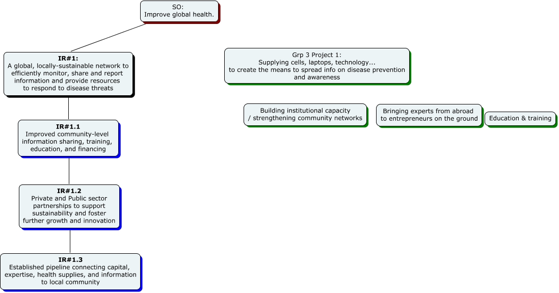 This Concept Map, created with IHMC CmapTools, has information related to: FreedomAshCarter -- RF, SO: Improve global health. IR#1: A global, locally-sustainable network to efficiently monitor, share and report information and provide resources to respond to disease threats, IR#1.2 Private and Public sector partnerships to support sustainability and foster further growth and innovation IR#1.3 Established pipeline connecting capital, expertise, health supplies, and information to local community, IR#1.1 Improved community-level information sharing, training, education, and financing IR#1.2 Private and Public sector partnerships to support sustainability and foster further growth and innovation, IR#1: A global, locally-sustainable network to efficiently monitor, share and report information and provide resources to respond to disease threats IR#1.1 Improved community-level information sharing, training, education, and financing