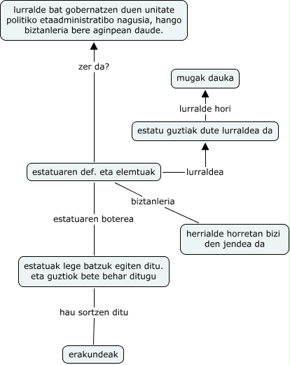 Este Cmap, tiene información relacionada con: estatua eta elementuak, estatuaren def. eta elemtuak zer da? lurralde bat gobernatzen duen unitate politiko etaadministratibo nagusia, hango biztanleria bere aginpean daude., estatuaren def. eta elemtuak lurraldea estatu guztiak dute lurraldea da, estatuaren def. eta elemtuak biztanleria herrialde horretan bizi den jendea da, estatuaren def. eta elemtuak estatuaren boterea estatuak lege batzuk egiten ditu. eta guztiok bete behar ditugu, estatu guztiak dute lurraldea da lurralde hori mugak dauka, estatuak lege batzuk egiten ditu. eta guztiok bete behar ditugu hau sortzen ditu erakundeak