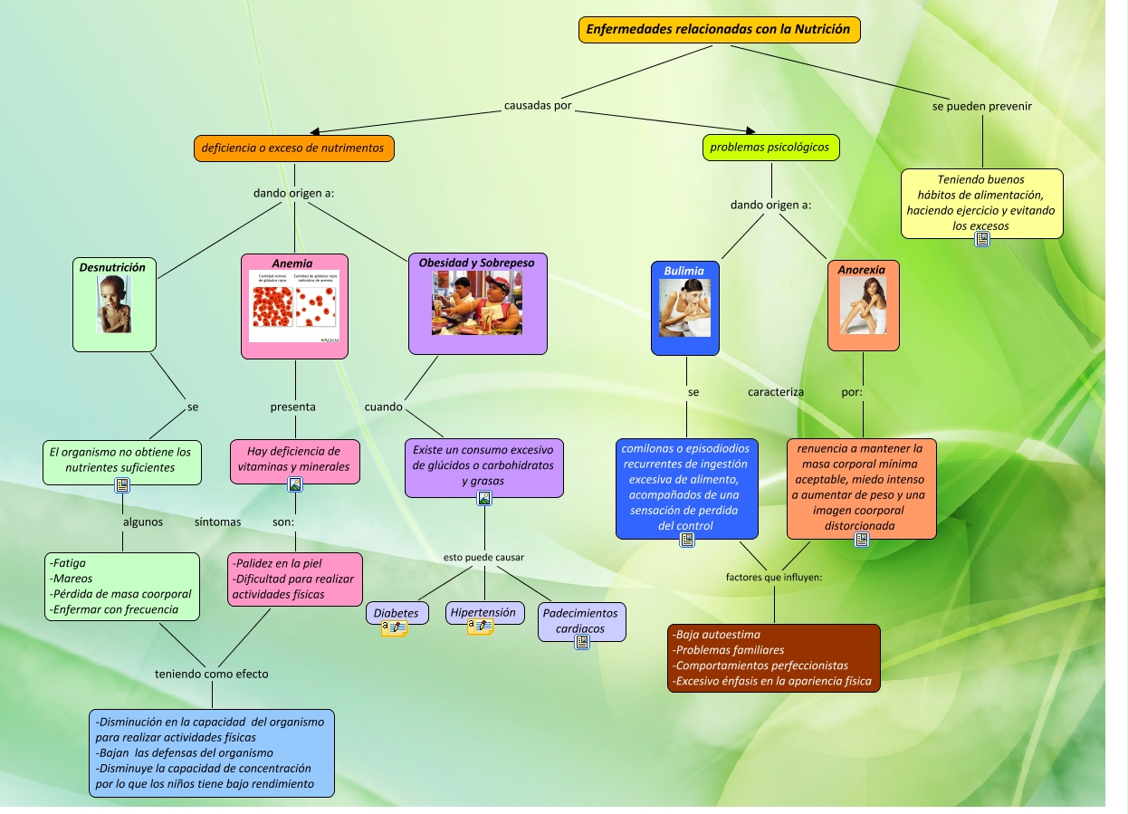 Este Cmap, tiene información relacionada con: enfermedades relacionadas con la nutricion, -Fatiga -Mareos -Pérdida de masa coorporal -Enfermar con frecuencia teniendo como efecto -Disminución en la capacidad del organismo para realizar actividades físicas -Bajan las defensas del organismo -Disminuye la capacidad de concentración por lo que los niños tiene bajo rendimiento, Desnutrición se presenta cuando Hay deficiencia de vitaminas y minerales, -Palidez en la piel -Dificultad para realizar actividades físicas teniendo como efecto -Disminución en la capacidad del organismo para realizar actividades físicas -Bajan las defensas del organismo -Disminuye la capacidad de concentración por lo que los niños tiene bajo rendimiento, Anemia se presenta cuando Hay deficiencia de vitaminas y minerales, problemas psicológicos dando origen a: Anorexia, Anorexia se caracteriza por: renuencia a mantener la masa corporal mínima aceptable, miedo intenso a aumentar de peso y una imagen coorporal distorcionada, El organismo no obtiene los nutrientes suficientes algunos síntomas son: -Palidez en la piel -Dificultad para realizar actividades físicas, deficiencia o exceso de nutrimentos dando origen a: Desnutrición, Existe un consumo excesivo de glúcidos o carbohidratos y grasas esto puede causar Diabetes, Existe un consumo excesivo de glúcidos o carbohidratos y grasas esto puede causar Padecimientos cardiacos, Obesidad y Sobrepeso se presenta cuando Hay deficiencia de vitaminas y minerales, Enfermedades relacionadas con la Nutrición causadas por problemas psicológicos, renuencia a mantener la masa corporal mínima aceptable, miedo intenso a aumentar de peso y una imagen coorporal distorcionada factores que influyen: -Baja autoestima -Problemas familiares -Comportamientos perfeccionistas -Excesivo énfasis en la apariencia física, Enfermedades relacionadas con la Nutrición causadas por deficiencia o exceso de nutrimentos, Bulimia se caracteriza por: renuencia a mantener la masa corporal mínima aceptable, miedo intenso a aumentar de peso y una imagen coorporal distorcionada, Enfermedades relacionadas con la Nutrición se pueden prevenir Teniendo buenos hábitos de alimentación, haciendo ejercicio y evitando los excesos, El organismo no obtiene los nutrientes suficientes se presenta cuando Hay deficiencia de vitaminas y minerales, problemas psicológicos dando origen a: Bulimia, Existe un consumo excesivo de glúcidos o carbohidratos y grasas esto puede causar Hipertensión, El organismo no obtiene los nutrientes suficientes algunos síntomas son: -Fatiga -Mareos -Pérdida de masa coorporal -Enfermar con frecuencia