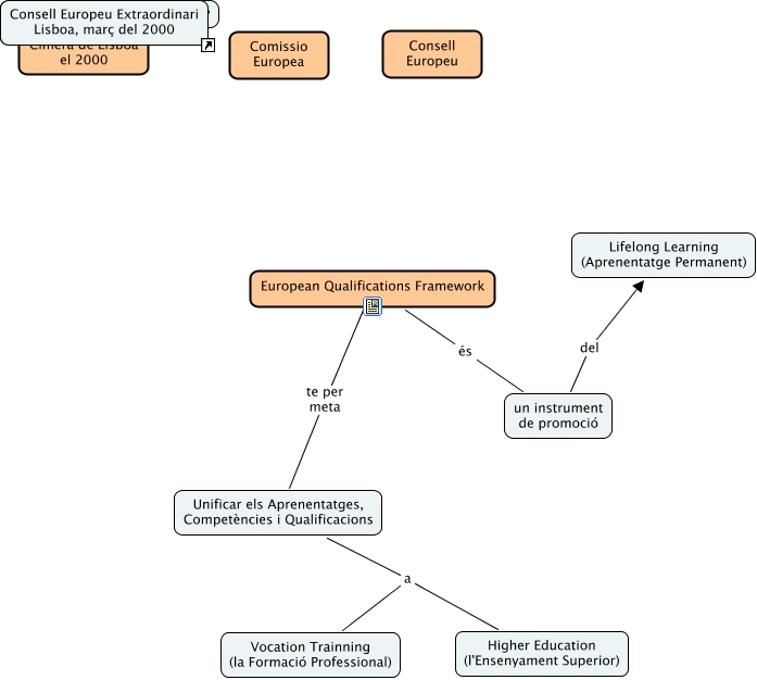 Aquest mapa conceptual conté informació relacionada amb: Objectius UE-European Qualification Framework, Consell Europeu Extraordinari Lisboa, març del 2000 ???? Cimera de Lisboa el 2000, Unificar els Aprenentatges, Competències i Qualificacions a Vocation Trainning (la Formació Professional), un instrument de promoció del Lifelong Learning (Aprenentatge Permanent), European Qualifications Framework te per meta Unificar els Aprenentatges, Competències i Qualificacions, Unificar els Aprenentatges, Competències i Qualificacions a Higher Education (l'Ensenyament Superior), European Qualifications Framework és un instrument de promoció, Consell Europeu Extraordinari Lisboa, març del 2000 ???? ????