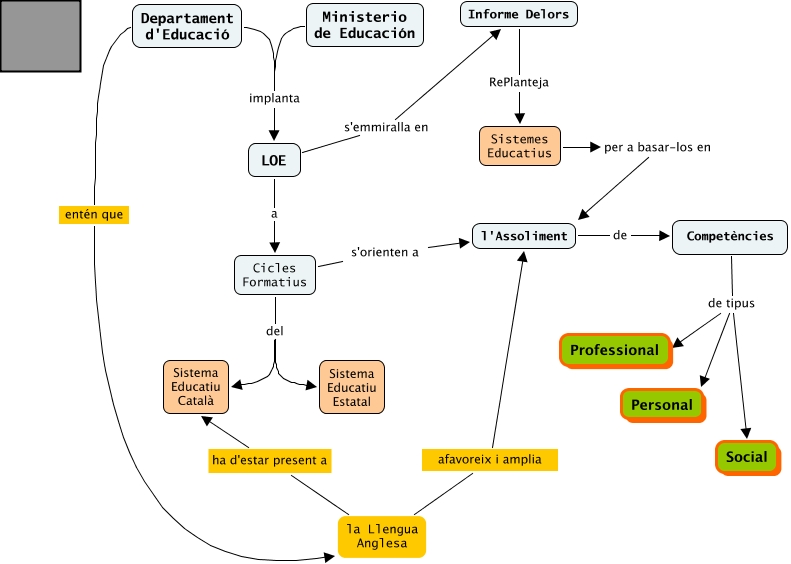 Aquest mapa conceptual conté informació relacionada amb: MarcReferenciaTFM, LOE s'emmiralla en Informe Delors, Cicles Formatius s'orienten a l'Assoliment, Competències de tipus Professional, Informe Delors RePlanteja Sistemes Educatius, Sistemes Educatius per a basar-los en l'Assoliment, l'Assoliment de Competències, LOE a Cicles Formatius, Competències de tipus Social, la Llengua Anglesa afavoreix i amplia l'Assoliment, Departament d'Educació entén que la Llengua Anglesa, Ministerio de Educación implanta LOE, Cicles Formatius del Sistema Educatiu Català, Departament d'Educació implanta LOE, Competències de tipus Personal, la Llengua Anglesa ha d'estar present a Sistema Educatiu Català, Cicles Formatius del Sistema Educatiu Estatal