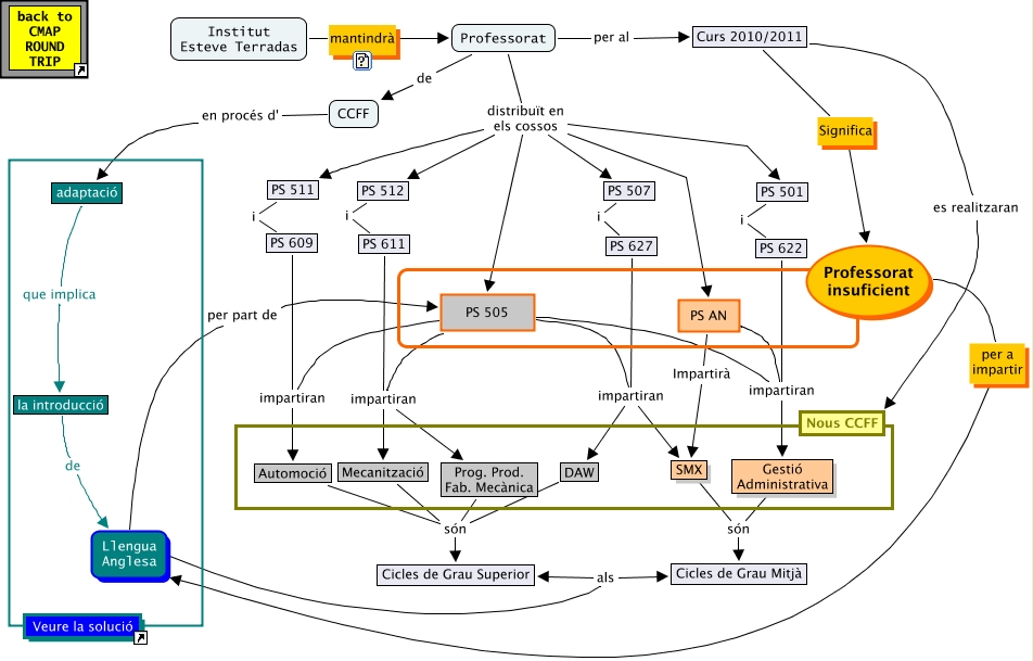Aquest mapa conceptual conté informació relacionada amb: EscenariFuturTFM, Llengua Anglesa per part de PS 505, PS 505 impartiran DAW, adaptació que implica la introducció, PS 507 i PS 627, Professorat distribuït en els cossos PS 501, PS 611 impartiran Mecanització, PS 511 i PS 609, Professorat distribuït en els cossos PS 512, la introducció de Llengua Anglesa, PS AN impartiran Gestió Administrativa, Curs 2010/2011 es realitzaran Nous CCFF, Professorat de CCFF, CCFF en procés d' adaptació, PS 501 i PS 622, PS 505 impartiran Mecanització, Professorat distribuït en els cossos PS 507, PS 512 i PS 611, Professorat distribuït en els cossos PS AN, SMX són Cicles de Grau Mitjà, PS 609 impartiran Automoció