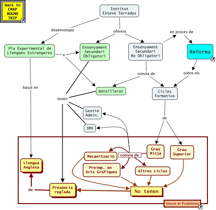 Aquest mapa conceptual conté informació relacionada amb: EscenariTFM, Grau Mitjà consta de Gestió Admin., Grau Mitjà consta de Mecanització, Grau Superior No tenen Presència reglada, Ensenyament Secundari Obligatori tenen Presència reglada, SMX tenen Gestió Admin., Cicles Formatius de Grau Superior, Institut Esteve Terradas ofereix Ensenyament Secundari Obligatori, Institut Esteve Terradas desenvolupa Pla Experimental de Llengües Estrangeres, Mecanització No tenen Presència reglada, Pla Experimental de Llengües Estrangeres a Ensenyament Secundari Obligatori, Ensenyament Secundari Obligatori tenen Batxillerat, Grau Mitjà consta de Altres cicles, Ensenyament Secundari Obligatori tenen Gestió Admin., Institut Esteve Terradas ofereix Ensenyament Secundari No Obligatori, SMX tenen Presència reglada, Pla Experimental de Llengües Estrangeres basat en Llengua Anglesa, Ensenyament Secundari No Obligatori consta de Cicles Formatius, Pla Experimental de Llengües Estrangeres a Batxillerat, Grau Mitjà consta de SMX, SMX tenen Batxillerat