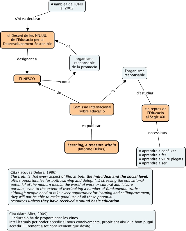 Aquest mapa conceptual conté informació relacionada amb: Objectius del Mil·lenni-Reptes per a l'Educació del Segle XXI, els reptes de l'Educacio al Segle XXI necessitats • aprendre a conèixer • aprendre a fer • aprendre a viure plegats • aprendre a ser, l'organisme responsable d'estudiar els reptes de l'Educacio al Segle XXI, Asamblea de l'ONU el 2002 s'hi va declarar el Deseni de les NN.UU. de l'Educacio per al Desenvolupament Sostenible, el Deseni de les NN.UU. de l'Educacio per al Desenvolupament Sostenible designant a l'UNESCO, Comissio Internacional sobre educacio es l'organisme responsable, Comissio Internacional sobre educacio de l'UNESCO, l'UNESCO com a organisme responsable de la promocio, organisme responsable de la promocio de el Deseni de les NN.UU. de l'Educacio per al Desenvolupament Sostenible, Comissio Internacional sobre educacio va publicar Learning, a treasure within (Informe Delors)