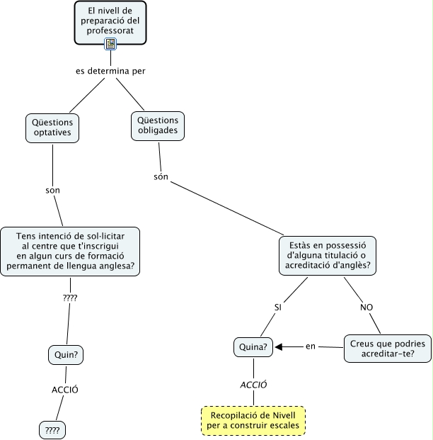 Aquest mapa conceptual conté informació relacionada amb: Enquesta de Preparació, Estàs en possessió d'alguna titulació o acreditació d'anglès? NO Creus que podries acreditar-te?, Creus que podries acreditar-te? en Quina?, El nivell de preparació del professorat es determina per Qüestions optatives, Qüestions obligades són Estàs en possessió d'alguna titulació o acreditació d'anglès?, Qüestions optatives son Tens intenció de sol·licitar al centre que t'inscrigui en algun curs de formació permanent de llengua anglesa?, Quina? ACCIÓ Recopilació de Nivell per a construir escales, Tens intenció de sol·licitar al centre que t'inscrigui en algun curs de formació permanent de llengua anglesa? ???? Quin?, El nivell de preparació del professorat es determina per Qüestions obligades, Estàs en possessió d'alguna titulació o acreditació d'anglès? SI Quina?, Quin? ACCIÓ ????