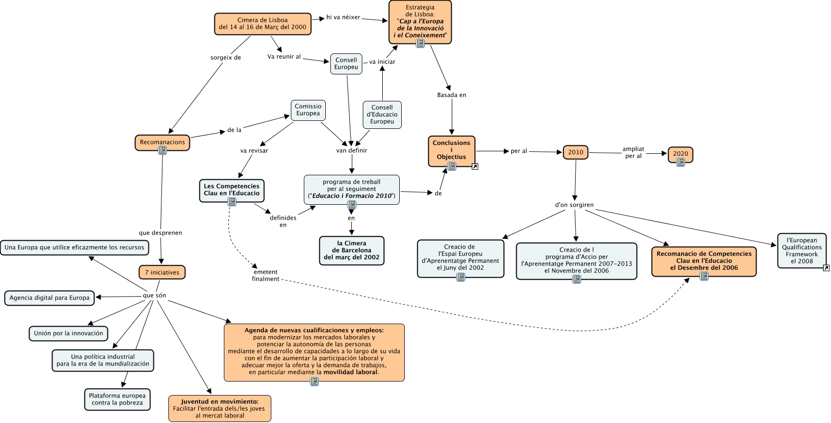 Aquest mapa conceptual conté informació relacionada amb: Objectius UE-Estratègia i Objectius Cimera de Lisboa 2000, 7 iniciatives que són Una Europa que utilice eficazmente los recursos, 7 iniciatives que són Unión por la innovación, 7 iniciatives que són Una política industrial para la era de la mundialización, Cimera de Lisboa del 14 al 16 de Març del 2000 Va reunir al Consell Europeu, 7 iniciatives que són Juventud en movimiento: Facilitar l'entrada dels/les joves al mercat laboral, Cimera de Lisboa del 14 al 16 de Març del 2000 sorgeix de Recomanacions, programa de treball per al seguiment ("Educacio i Formacio 2010") de Conclusions i Objectius, Consell Europeu va iniciar Estrategia de Lisboa: "Cap a l'Europa de la Innovació i el Coneixement", 2010 d'on sorgiren Creacio de l'Espai Europeu d'Aprenentatge Permanent el Juny del 2002, 7 iniciatives que són Plataforma europea contra la pobreza, Comissio Europea va revisar Les Competencies Clau en l'Educacio, 7 iniciatives que són Agenda de nuevas cualificaciones y empleos: para modernizar los mercados laborales y potenciar la autonomía de las personas mediante el desarrollo de capacidades a lo largo de su vida con el fin de aumentar la participación laboral y adecuar mejor la oferta y la demanda de trabajos, en particular mediante la movilidad laboral., programa de treball per al seguiment ("Educacio i Formacio 2010") en la Cimera de Barcelona del març del 2002, Conclusions i Objectius per al 2010, Consell d'Educacio Europeu va iniciar Estrategia de Lisboa: "Cap a l'Europa de la Innovació i el Coneixement", Estrategia de Lisboa: "Cap a l'Europa de la Innovació i el Coneixement" Basada en Conclusions i Objectius, 2010 ampliat per al 2020, Comissio Europea van definir programa de treball per al seguiment ("Educacio i Formacio 2010"), Recomanacions que desprenen 7 iniciatives, 2010 d'on sorgiren l'European Qualifications Framework el 2008