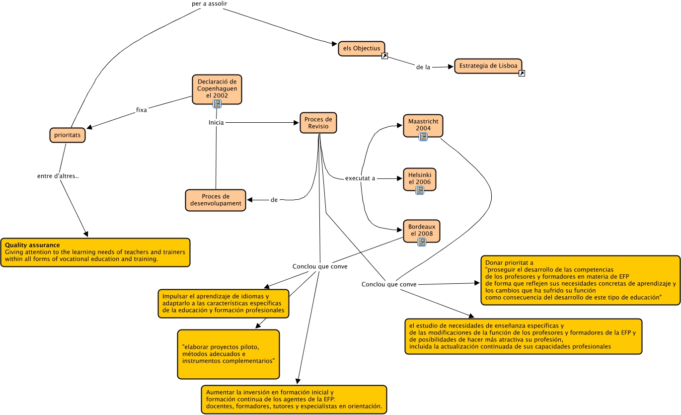 Aquest mapa conceptual conté informació relacionada amb: Objectius UE-Procés de Copenhaguen 2002, Proces de Revisio Conclou que conve "elaborar proyectos piloto, métodos adecuados e instrumentos complementarios", Declaració de Copenhaguen el 2002 Inicia Proces de Revisio, prioritats per a assolir els Objectius, Declaració de Copenhaguen el 2002 fixa prioritats, Proces de Revisio Conclou que conve el estudio de necesidades de enseñanza específicas y de las modificaciones de la función de los profesores y formadores de la EFP y de posibilidades de hacer más atractiva su profesión, incluida la actualización continuada de sus capacidades profesionales, prioritats entre d'altres.. Quality assurance Giving attention to the learning needs of teachers and trainers within all forms of vocational education and training., Proces de Revisio executat a Helsinki el 2006, Bordeaux el 2008 Conclou que conve Impulsar el aprendizaje de idiomas y adaptarlo a las características específicas de la educación y formación profesionales, Maastricht 2004 Conclou que conve el estudio de necesidades de enseñanza específicas y de las modificaciones de la función de los profesores y formadores de la EFP y de posibilidades de hacer más atractiva su profesión, incluida la actualización continuada de sus capacidades profesionales, Proces de Revisio executat a Maastricht 2004, Maastricht 2004 Conclou que conve Donar prioritat a "proseguir el desarrollo de las competencias de los profesores y formadores en materia de EFP de forma que reflejen sus necesidades concretas de aprendizaje y los cambios que ha sufrido su función como consecuencia del desarrollo de este tipo de educación", els Objectius de la Estrategia de Lisboa, Proces de Revisio executat a Bordeaux el 2008, Proces de Revisio Conclou que conve Donar prioritat a "proseguir el desarrollo de las competencias de los profesores y formadores en materia de EFP de forma que reflejen sus necesidades concretas de aprendizaje y los cambios que ha sufrido su función como consecuencia del desarrollo de este tipo de educación", Bordeaux el 2008 Conclou que conve Aumentar la inversión en formación inicial y formación continua de los agentes de la EFP: docentes, formadores, tutores y especialistas en orientación., Declaració de Copenhaguen el 2002 Inicia Proces de desenvolupament, Proces de Revisio Conclou que conve Impulsar el aprendizaje de idiomas y adaptarlo a las características específicas de la educación y formación profesionales, Proces de Revisio de Proces de desenvolupament, Proces de Revisio Conclou que conve Aumentar la inversión en formación inicial y formación continua de los agentes de la EFP: docentes, formadores, tutores y especialistas en orientación., Bordeaux el 2008 Conclou que conve "elaborar proyectos piloto, métodos adecuados e instrumentos complementarios"