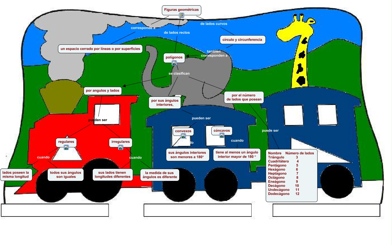 Este Cmap, tiene información relacionada con: Figuras, por sus ángulos interiores, pueden ser convexos, cóncavos cuando tiene al menos un ángulo interior mayor de 180 °, polígonos se clasifican por angulos y lados, irregulares cuando sus lados tienen longitudes diferentes, Figuras geométricas corresponde a un espacio cerrado por líneas o por superficies, por angulos y lados pueden ser regulares, Figuras geométricas de lados rectos polígonos, convexos cuando sus ángulos interiores son menores a 180°, por angulos y lados pueden ser irregulares, por el número de lados que posean puede ser Nombre Número de lados Triángulo 3 Cuadrilátero 4 Pentágono 5 Hexágono 6 Heptágono 7 Octágono 8 Eneágono 9 Decágono 10 Undecágono 11 Dodecágono 12, regulares cuando lados poseen la misma longitud, por sus ángulos interiores, pueden ser cóncavos, polígonos se clasifican por sus ángulos interiores,, polígonos se clasifican por el número de lados que posean, irregulares cuando la medida de sus ángulos es diferente, Figuras geométricas de lados curvos círculo y circunferencia, regulares cuando todos sus ángulos son iguales, círculo y circunferencia también corresponden a polígonos