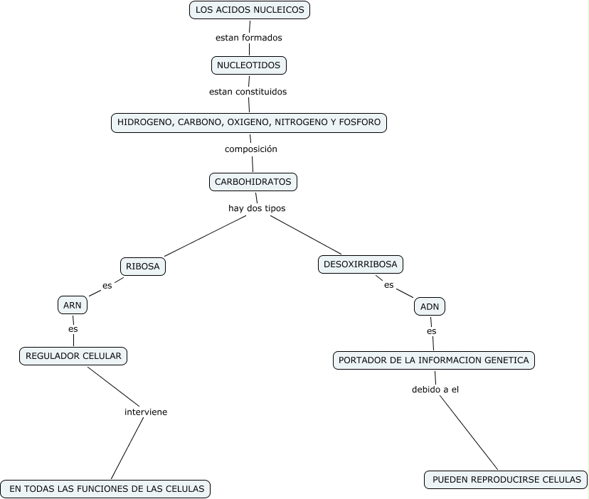 Este Cmap, tiene información relacionada con: LOS ACIDOS NUCLEICOS, DESOXIRRIBOSA es ADN, CARBOHIDRATOS hay dos tipos DESOXIRRIBOSA, RIBOSA es ARN, ADN es PORTADOR DE LA INFORMACION GENETICA, NUCLEOTIDOS estan constituidos HIDROGENO, CARBONO, OXIGENO, NITROGENO Y FOSFORO, ARN es REGULADOR CELULAR, CARBOHIDRATOS hay dos tipos RIBOSA, HIDROGENO, CARBONO, OXIGENO, NITROGENO Y FOSFORO composición CARBOHIDRATOS, REGULADOR CELULAR interviene EN TODAS LAS FUNCIONES DE LAS CELULAS, PORTADOR DE LA INFORMACION GENETICA debido a el PUEDEN REPRODUCIRSE CELULAS, LOS ACIDOS NUCLEICOS estan formados NUCLEOTIDOS
