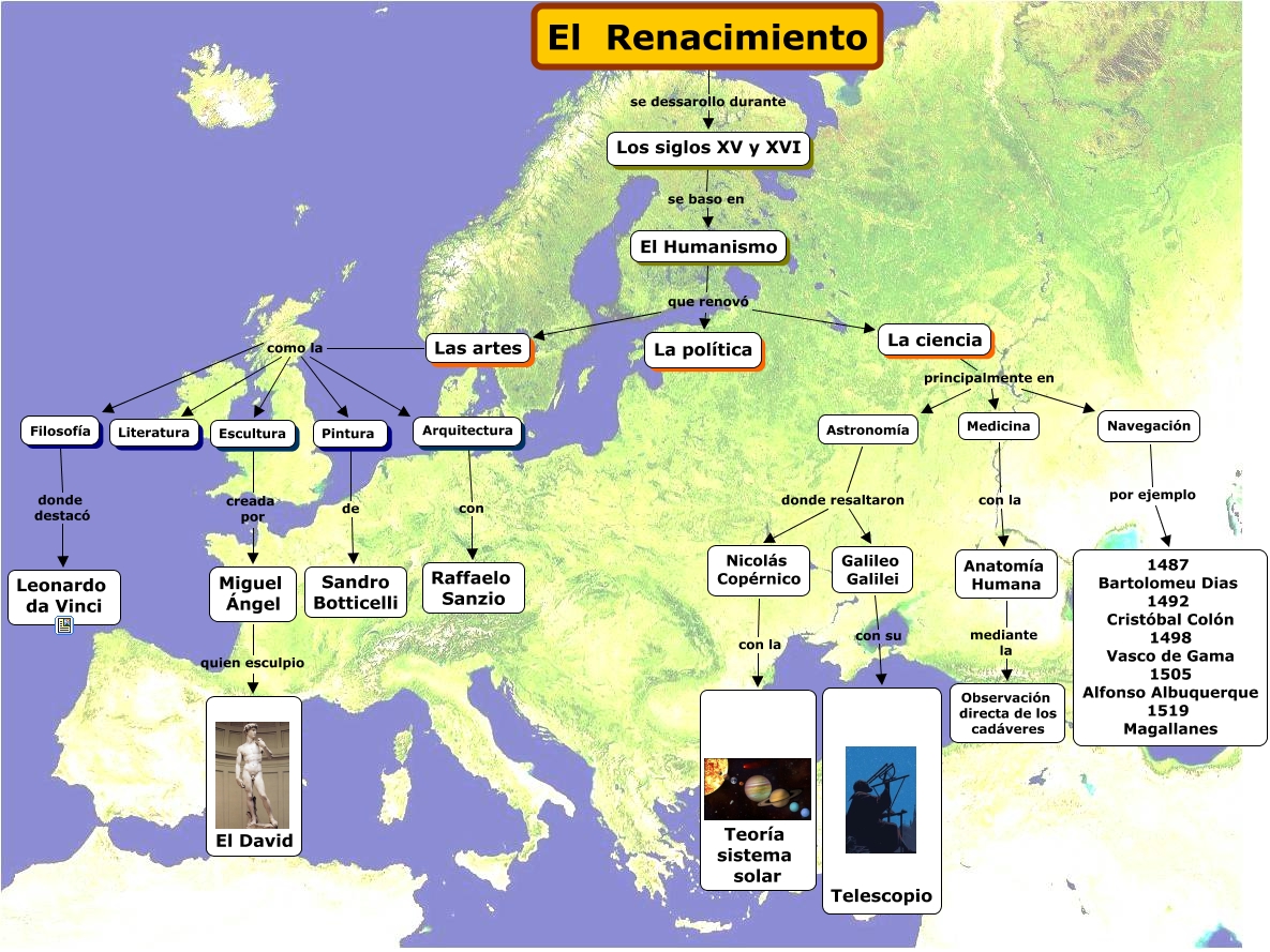 Este Cmap, tiene información relacionada con: El renacimiento, El Humanismo que renovó La ciencia, Navegación por ejemplo 1487 Bartolomeu Dias 1492 Cristóbal Colón 1498 Vasco de Gama 1505 Alfonso Albuquerque 1519 Magallanes, Astronomía donde resaltaron Nicolás Copérnico, Los siglos XV y XVI se baso en El Humanismo, Escultura creada por Miguel Ángel, Astronomía donde resaltaron Galileo Galilei, Arquitectura con Raffaelo Sanzio, Miguel Ángel quien esculpio El David, Medicina con la Anatomía Humana, Las artes como la Pintura, Filosofía donde destacó Leonardo da Vinci, Galileo Galilei con su Telescopio, Las artes como la Filosofía, Las artes como la Escultura, El Renacimiento se dessarollo durante Los siglos XV y XVI, Pintura de Sandro Botticelli, Las artes como la Arquitectura, La ciencia principalmente en Astronomía, Las artes como la Literatura, El Humanismo que renovó La política
