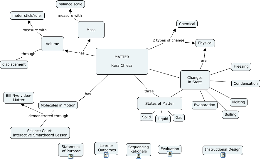 This Concept Map, created with IHMC CmapTools, has information related to: KChiesa_cmap, MATTER Kara Chiesa 2 types of change Chemical, Mass measure with balance scale, Molecules in Motion demonstrated through Science Court Interactive Smartboard Lesson, States of Matter - Gas, Changes in State ???? Condensation, MATTER Kara Chiesa has Mass, Changes in State are Physical, Volume measure with meter stick/ruler, MATTER Kara Chiesa 2 types of change Physical, MATTER Kara Chiesa has Volume, MATTER Kara Chiesa has Molecules in Motion, Physical 2 types of change Chemical, MATTER Kara Chiesa three States of Matter, Changes in State ???? Boiling, Molecules in Motion demonstrated through Bill Nye video- Matter, States of Matter - Liquid, Changes in State ???? Melting, Changes in State Evaporation, Volume through displacement, States of Matter - Solid
