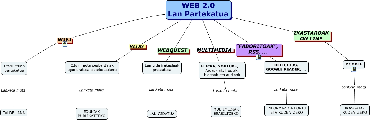 Este Cmap, tiene información relacionada con: WEB 2.0 LAN PARTEKATUA, WEB 2.0 Lan Partekatua IKASTAROAK ON LINE MOODLE, Lan gida irakasleak prestatuta Lanketa mota LAN GIDATUA, FLICKR, YOUTUBE, ... Argazkiak, irudiak, bideoak eta audioak Lanketa mota MULTIMEDIAK ERABILTZEKO, Testu edizio partekatua Lanketa mota TALDE LANA, MOODLE Lanketa mota IKASGAIAK KUDEATZEKO, WEB 2.0 Lan Partekatua BLOG Eduki mota desberdinak eguneratuta izateko aukera, WEB 2.0 Lan Partekatua WEBQUEST Lan gida irakasleak prestatuta, WEB 2.0 Lan Partekatua MULTIMEDIA FLICKR, YOUTUBE, ... Argazkiak, irudiak, bideoak eta audioak, Eduki mota desberdinak eguneratuta izateko aukera Lanketa mota EDUKIAK PUBLIKATZEKO, WEB 2.0 Lan Partekatua WIKI Testu edizio partekatua, WEB 2.0 Lan Partekatua "FABORITOAK", RSS, ... DELICIOUS, GOOGLE READER, ..., DELICIOUS, GOOGLE READER, ... Lanketa mota INFORMAZIOA LORTU ETA KUDEATZEKO