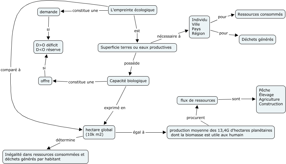 This Concept Map, created with IHMC CmapTools, has information related to: Empreinte écologique, L'empreinte écologique constitue une demande, Individu Ville Pays Région pour Déchets générés, hectare global (10k m2) égal à production moyenne des 13,4G d'hectares planétaires dont la biomasse est utile aux humain, Superficie terres ou eaux productives possède Capacité biologique, hectare global (10k m2) détermine Inégalité dans ressources consommées et déchets générés par habitant, Capacité biologique exprimé en hectare global (10k m2), Superficie terres ou eaux productives nécessaire à Individu Ville Pays Région, L'empreinte écologique est Superficie terres ou eaux productives, production moyenne des 13,4G d'hectares planétaires dont la biomasse est utile aux humain procurent flux de ressources, offre si D>O déficit D<O réserve, flux de ressources sont Pêche Élevage Agriculture Construction, Capacité biologique constitue une offre, Individu Ville Pays Région pour Ressources consommés, L'empreinte écologique comparé à hectare global (10k m2), demande si D>O déficit D<O réserve