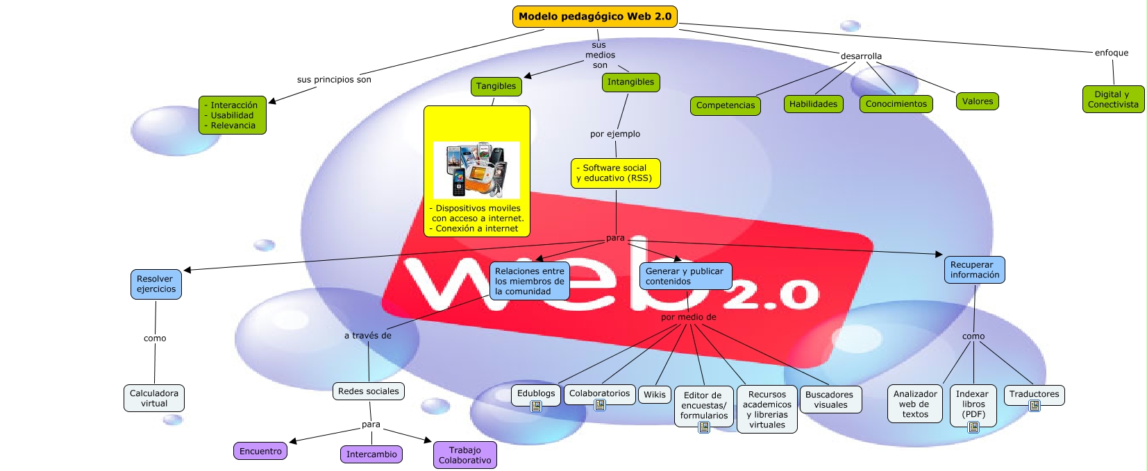 Este Cmap, tiene información relacionada con: Modelo Pedagogico Web 2.0, Generar y publicar contenidos por medio de Edublogs, Generar y publicar contenidos por medio de Wikis, Resolver ejercicios como Calculadora virtual, Redes sociales para Trabajo Colaborativo, - Software social y educativo (RSS) para Recuperar información, Generar y publicar contenidos por medio de Editor de encuestas/ formularios, - Software social y educativo (RSS) para Relaciones entre los miembros de la comunidad, Recuperar información como Analizador web de textos, Intangibles por ejemplo - Software social y educativo (RSS), Modelo pedagógico Web 2.0 sus medios son Intangibles, Relaciones entre los miembros de la comunidad a través de Redes sociales, Recuperar información como Indexar libros (PDF), Modelo pedagógico Web 2.0 sus medios son Tangibles, Tangibles como - Dispositivos moviles con acceso a internet. - Conexión a internet, Modelo pedagógico Web 2.0 desarrolla Habilidades, - Software social y educativo (RSS) para Generar y publicar contenidos, Modelo pedagógico Web 2.0 enfoque Digital y Conectivista, Modelo pedagógico Web 2.0 desarrolla Competencias, Modelo pedagógico Web 2.0 desarrolla Conocimientos, - Software social y educativo (RSS) para Resolver ejercicios