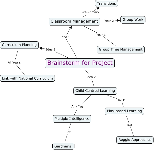 This Concept Map, created with IHMC CmapTools, has information related to: Example for Project Brainstorm, Classroom Management Pre-Primary Transitions, Play-based Learning Ref Reggio Approaches, Brainstorm for Project Idea 3 Curriculum Planning, Brainstorm for Project Idea 2 Child Centred Learning, Child Centred Learning Any Year Multiple Intelligence, Classroom Management Year 2 Group Work, Multiple Intelligence Ref Gardner's, Curriculum Planning All Years Link with National Curriculum, Brainstorm for Project Idea 1 Classroom Management, Classroom Management Year 1 Group Time Management, Child Centred Learning K/PP Play-based Learning