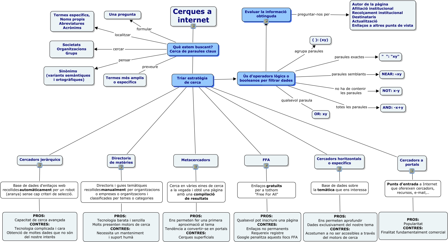 Aquest mapa conceptual conté informació relacionada amb: Cercadors_internet5, Enllaços gratuïts per a tothom "Free For All" PROS: Qualsevol pot inscriure una pàgina CONTRES: Enllaços no permanents Requereix registre Google penalitza aquests llocs FFA, Triar estratègia de cerca Cercadors horitzontals o específics, Evaluar la informació obtinguda preguntar-nos per Autor de la pàgina Afiliació institucional Recolçament institucional Destinataris Actualització Enllaços a altres punts de vista, Què estem buscant? Cerca de paraules claus preveure Termes més amplis o específics, Base de dades d'enllaços web recollides automàticament per un robot (aranya) sense cap criteri de selecció. PROS: Capacitat de cerca avançada CONTRES: Tecnologia complicada i cara Obtenció de moltes dades que no són del nostre interès, Triar estratègia de cerca Cercadors jeràrquics, Ús d'operadors lògics o booleanos per filtrar dades qualsevol paraula OR: xy, Ús d'operadors lògics o booleanos per filtrar dades no ha de contenir les paraules NOT: x-y, Ús d'operadors lògics o booleanos per filtrar dades paraules exactes " ": "xy", Cercadors a portals Punts d'entrada a Internet que ofereixen cercadors, recursos, e-mail,.., Triar estratègia de cerca Ús d'operadors lògics o booleanos per filtrar dades, Cerques a internet Què estem buscant? Cerca de paraules claus, Què estem buscant? Cerca de paraules claus Triar estratègia de cerca, Metacercadors Cerca en vàries eines de cerca a la vegada i obté una pàgina amb una compilació de resultats, Triar estratègia de cerca Cercadors a portals, Ús d'operadors lògics o booleanos per filtrar dades paraules semblants NEAR: ≈xy, Cerca en vàries eines de cerca a la vegada i obté una pàgina amb una compilació de resultats PROS: Ens permeten fer una primera aproximació al tema Tendència a convertir-se en portals CONTRES: Cerques superficials, Triar estratègia de cerca FFA, Què estem buscant? Cerca de paraules claus localitzar Termes específics, Noms propis Abreviatures Acrònims, Ús d'operadors lògics o booleanos per filtrar dades agrupa paraules ( ): (xy)