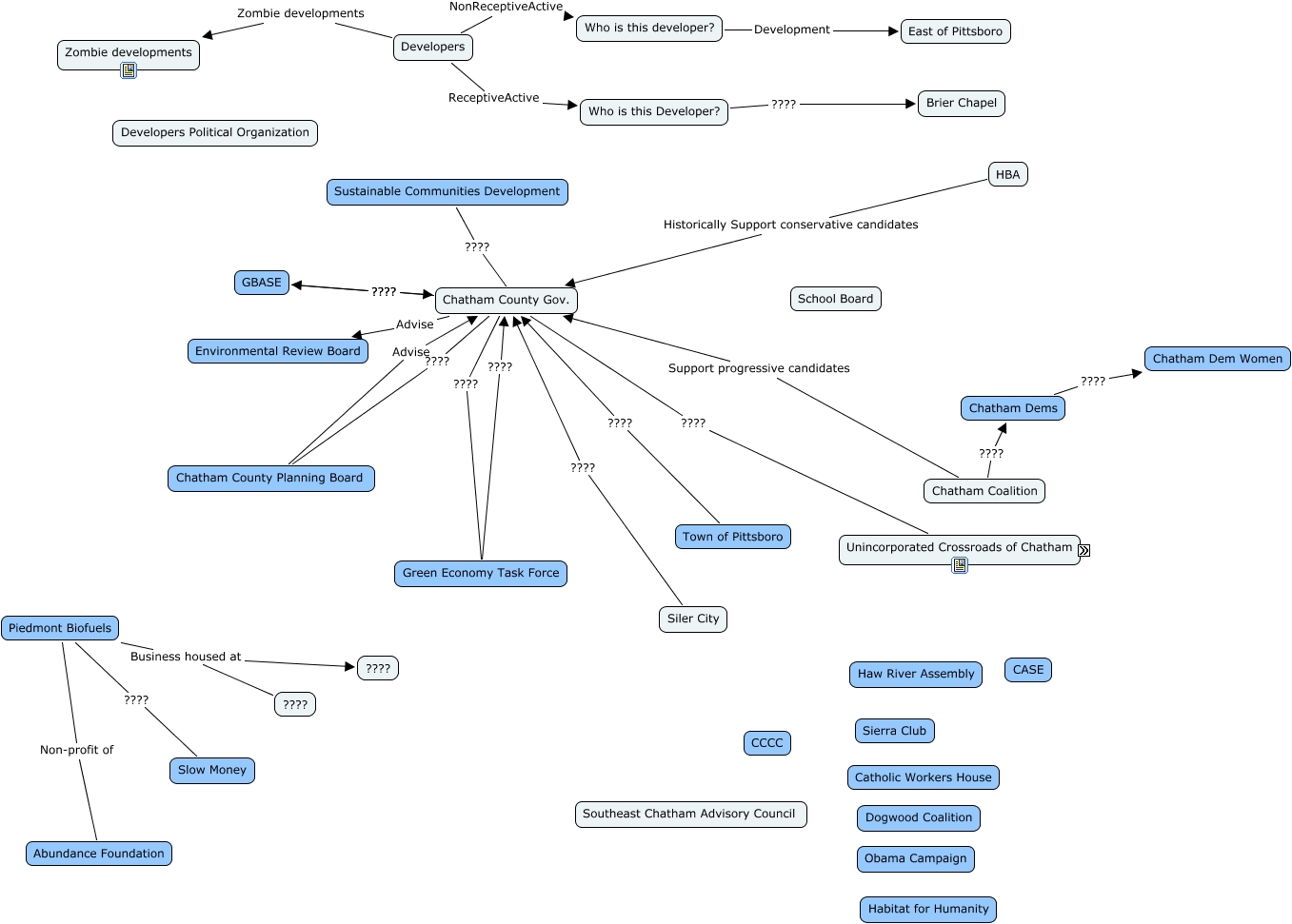 This Concept Map, created with IHMC CmapTools, has information related to: Chatham Orgs Relations, Chatham Coalition Support progressive candidates Chatham County Gov., Sustainable Communities Development ???? Chatham County Gov., Piedmont Biofuels ???? Slow Money, Town of Pittsboro ???? Chatham County Gov., Developers NonReceptiveActive Who is this developer?, HBA Historically Support conservative candidates Chatham County Gov., Piedmont Biofuels Business housed at ????, Developers ReceptiveActive Who is this Developer?, Who is this developer? Development East of Pittsboro, Who is this Developer? ???? Brier Chapel, GBASE ???? Chatham County Gov., Chatham County Gov. ???? GBASE, Chatham County Gov. ???? Unincorporated Crossroads of Chatham, Piedmont Biofuels Non-profit of Abundance Foundation, Chatham County Gov. ???? Chatham County Planning Board, Siler City ???? Chatham County Gov., Piedmont Biofuels Business housed at ????, Developers Zombie developments Zombie developments, Chatham Dems ???? Chatham Dem Women, Chatham Coalition ???? Chatham Dems
