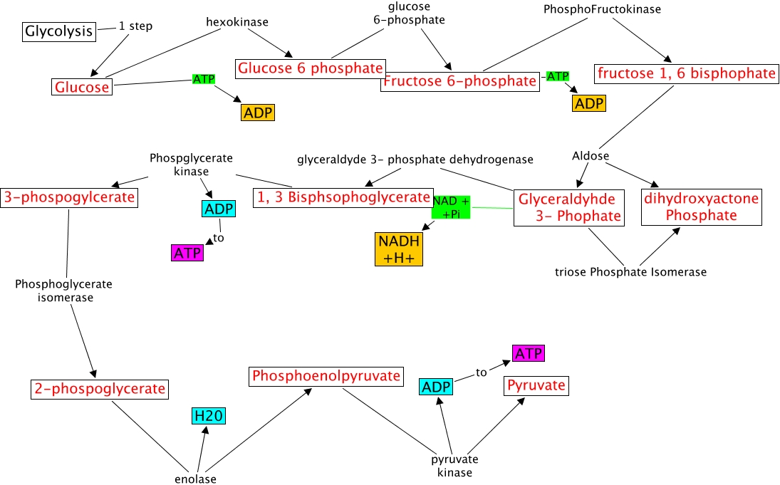 Dieses mit IHMC CmapTools erstellte CMap hat Informationen bezüglich: glycolisis3, fructose 1, 6 bisphophate Aldose dihydroxyactone Phosphate, 1, 3 Bisphsophoglycerate Phospglycerate kinase ADP, Fructose 6-phosphate ATP ADP, Glyceraldyhde 3- Phophate glyceraldyde 3- phosphate dehydrogenase 1, 3 Bisphsophoglycerate, fructose 1, 6 bisphophate Aldose Glyceraldyhde 3- Phophate, Glyceraldyhde 3- Phophate triose Phosphate Isomerase dihydroxyactone Phosphate, ADP to ATP, Glucose 6 phosphate glucose 6-phosphate Fructose 6-phosphate, Phosphoenolpyruvate pyruvate kinase Pyruvate, Glycolysis 1 step Glucose, Glucose ATP ADP, Fructose 6-phosphate PhosphoFructokinase fructose 1, 6 bisphophate, 2-phospoglycerate enolase Phosphoenolpyruvate, ADP to ATP, 2-phospoglycerate enolase H20, Glucose hexokinase Glucose 6 phosphate, 1, 3 Bisphsophoglycerate Phospglycerate kinase 3-phospogylcerate, 3-phospogylcerate Phosphoglycerate isomerase 2-phospoglycerate, Phosphoenolpyruvate pyruvate kinase ADP, Glyceraldyhde 3- Phophate NAD + +Pi NADH +H+