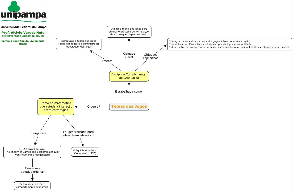 Esse mapa conceitual, produzido no IHMC CmapTools, tem a informação relacionada a: Teoria dos Jogos, 1944 através do livro: The Theory of Games and Economic Behavior Von Neumann e Morgenstern Tem como objetivo original Descrever e prever o comportamento econômico, Disciplina Complementar de Graduação Objetivo Geral Utilizar a teoria dos jogos para auxiliar o processo de formulação de estratégias organizacionais., Ramo da matemática que estuda a interação entre estratégias Surgiu em 1944 através do livro: The Theory of Games and Economic Behavior Von Neumann e Morgenstern, Teoria dos Jogos É trabalhada como Disciplina Complementar de Graduação, Teoria dos Jogos O que é? Ramo da matemática que estuda a interação entre estratégias, Disciplina Complementar de Graduação Objetivos Específicos * integrar os conceitos da teoria dos jogos à área de administração; * reconhecer e diferenciar os principais tipos de jogos e sua utilidade * desenvolver as competências necessárias para selecionar racionalmente estratégias organizacionais, Ramo da matemática que estuda a interação entre estratégias Foi generalizada para outras áreas através do O Equilíbrio de Nash (John Nash, 1950), Disciplina Complementar de Graduação Ementa Introdução à teoria dos jogos Teoria dos jogos e a administração Modelagem dos jogos