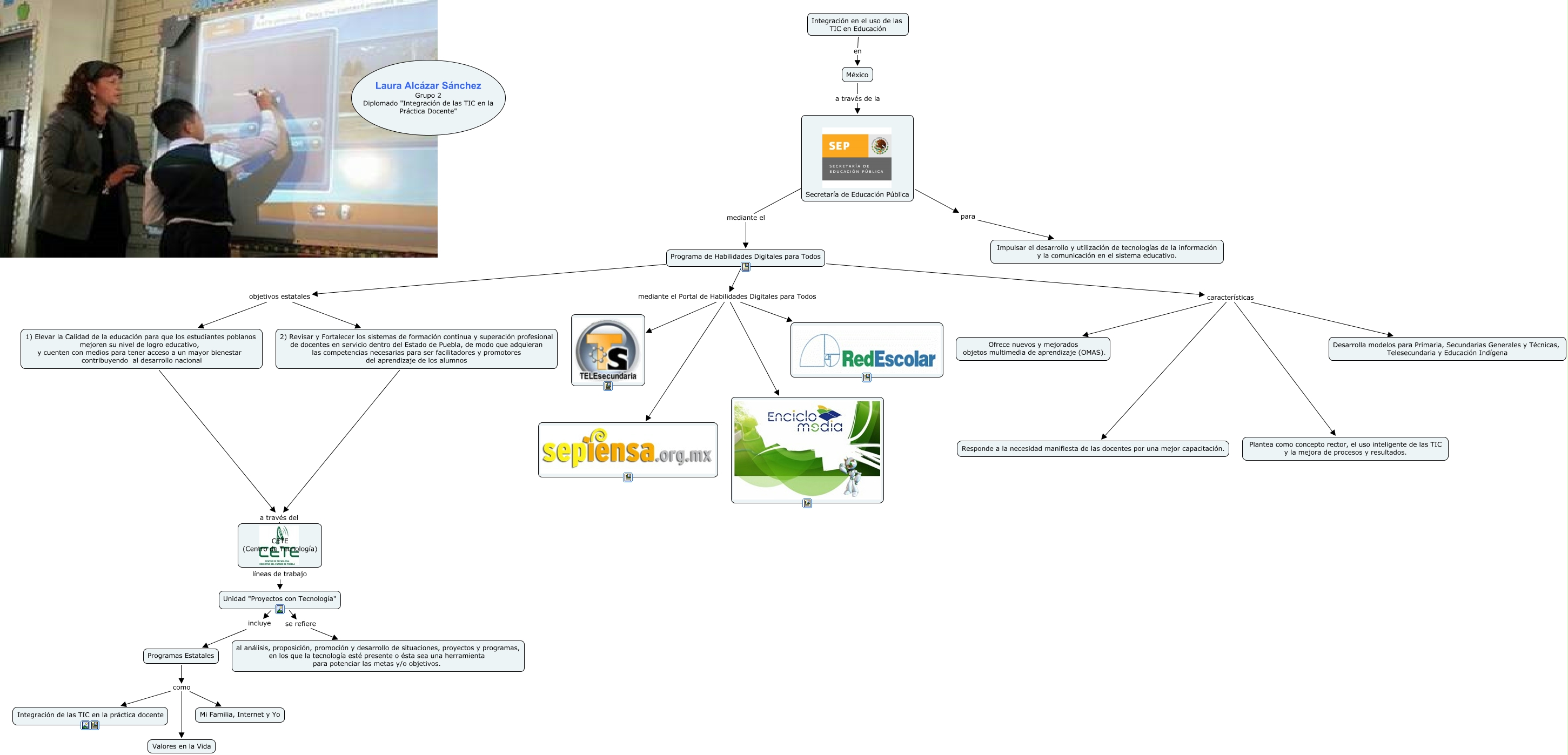 Este Cmap, tiene información relacionada con: TICS en la educación en Mexico, Programa de Habilidades Digitales para Todos mediante el Portal de Habilidades Digitales para Todos, 1) Elevar la Calidad de la educación para que los estudiantes poblanos mejoren su nivel de logro educativo, y cuenten con medios para tener acceso a un mayor bienestar contribuyendo al desarrollo nacional a través del CETE (Centro de Tecnología), Programa de Habilidades Digitales para Todos mediante el Portal de Habilidades Digitales para Todos, Programas Estatales como Valores en la Vida, Programa de Habilidades Digitales para Todos características Ofrece nuevos y mejorados objetos multimedia de aprendizaje (OMAS)., Secretaría de Educación Pública para Impulsar el desarrollo y utilización de tecnologías de la información y la comunicación en el sistema educativo., México a través de la Secretaría de Educación Pública, Programa de Habilidades Digitales para Todos características Responde a la necesidad manifiesta de las docentes por una mejor capacitación., Programa de Habilidades Digitales para Todos objetivos estatales 1) Elevar la Calidad de la educación para que los estudiantes poblanos mejoren su nivel de logro educativo, y cuenten con medios para tener acceso a un mayor bienestar contribuyendo al desarrollo nacional, Programa de Habilidades Digitales para Todos objetivos estatales 2) Revisar y Fortalecer los sistemas de formación continua y superación profesional de docentes en servicio dentro del Estado de Puebla, de modo que adquieran las competencias necesarias para ser facilitadores y promotores del aprendizaje de los alumnos, Unidad "Proyectos con Tecnología" se refiere al análisis, proposición, promoción y desarrollo de situaciones, proyectos y programas, en los que la tecnología esté presente o ésta sea una herramienta para potenciar las metas y/o objetivos., Programa de Habilidades Digitales para Todos mediante el Portal de Habilidades Digitales para Todos, CETE (Centro de Tecnología) líneas de trabajo Unidad "Proyectos con Tecnología", Programa de Habilidades Digitales para Todos características Desarrolla modelos para Primaria, Secundarias Generales y Técnicas, Telesecundaria y Educación Indígena, Programa de Habilidades Digitales para Todos mediante el Portal de Habilidades Digitales para Todos, Programas Estatales como Mi Familia, Internet y Yo, Unidad "Proyectos con Tecnología" incluye Programas Estatales, 2) Revisar y Fortalecer los sistemas de formación continua y superación profesional de docentes en servicio dentro del Estado de Puebla, de modo que adquieran las competencias necesarias para ser facilitadores y promotores del aprendizaje de los alumnos a través del CETE (Centro de Tecnología), Integración en el uso de las TIC en Educación en México, Programas Estatales como Integración de las TIC en la práctica docente